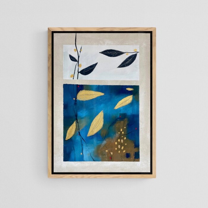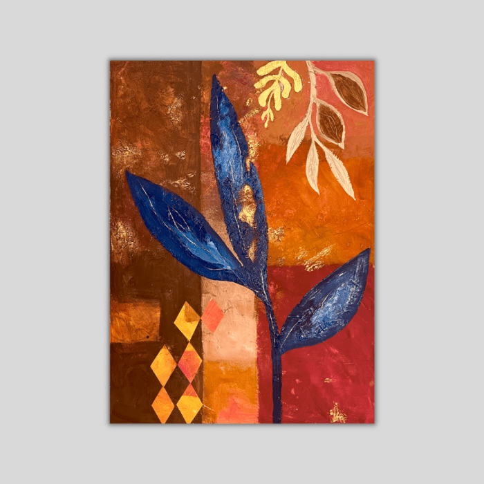 Il dipinto su tela di 70×50 cm è una straordinaria espressione di creativitĂ e maestria artistica. La scelta di dividere la tela in due porzioni, con uno sfondo bianco e uno sfondo blu scuro, crea un contrasto affascinante. Le foglie in nero con dettagli in […]