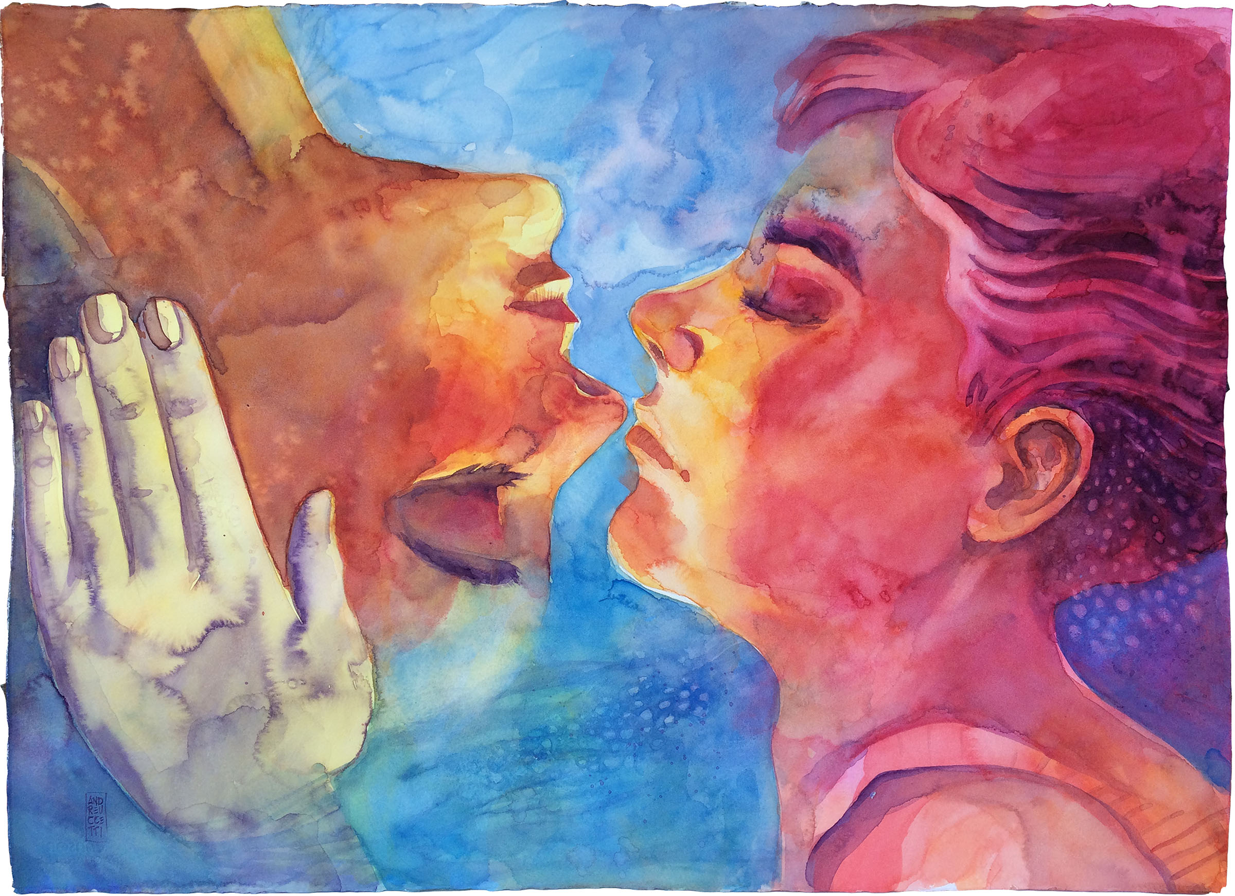 I simply adore the abstract flow of the image, and your control over the colours is impeccable. You really used the unique properties of the paint to your advantage, giving the piece texture and a dream-like atmosphere. I especially like the added dots, which really lift the picture and give it just that bit more detail. The contrast between the blue sea and warmth of the bodies also provides balance to your painting, and our eyes are nicely led towards the closed eye of the right person because of how it sits on the cross-section of the rule of thirds line.