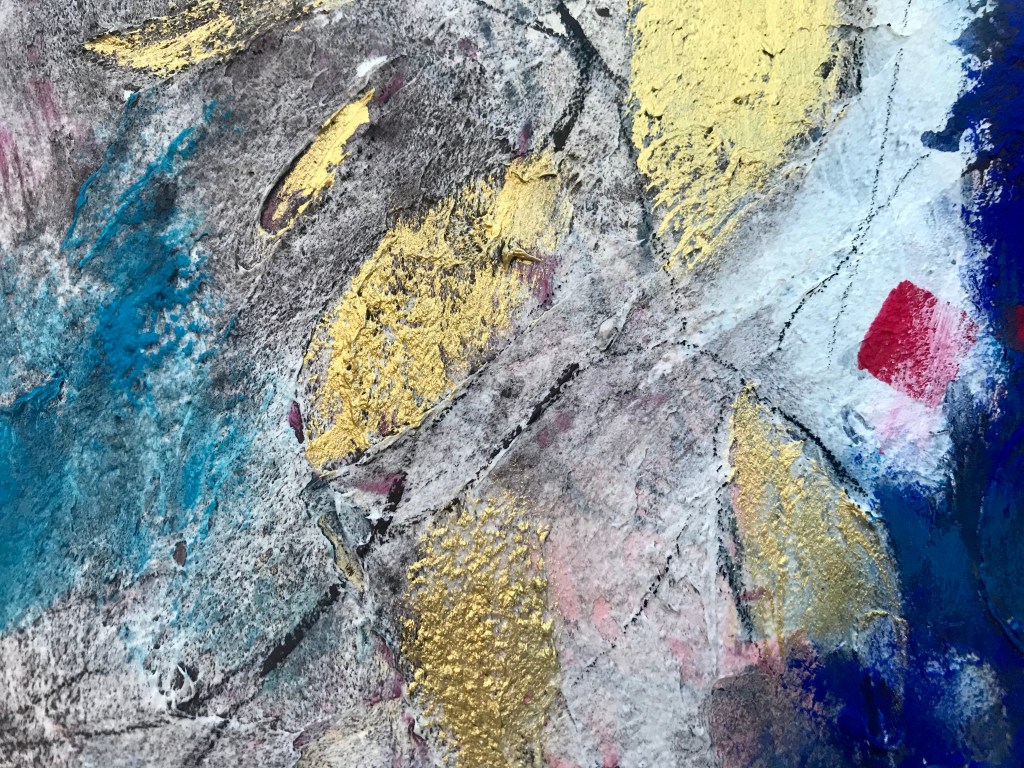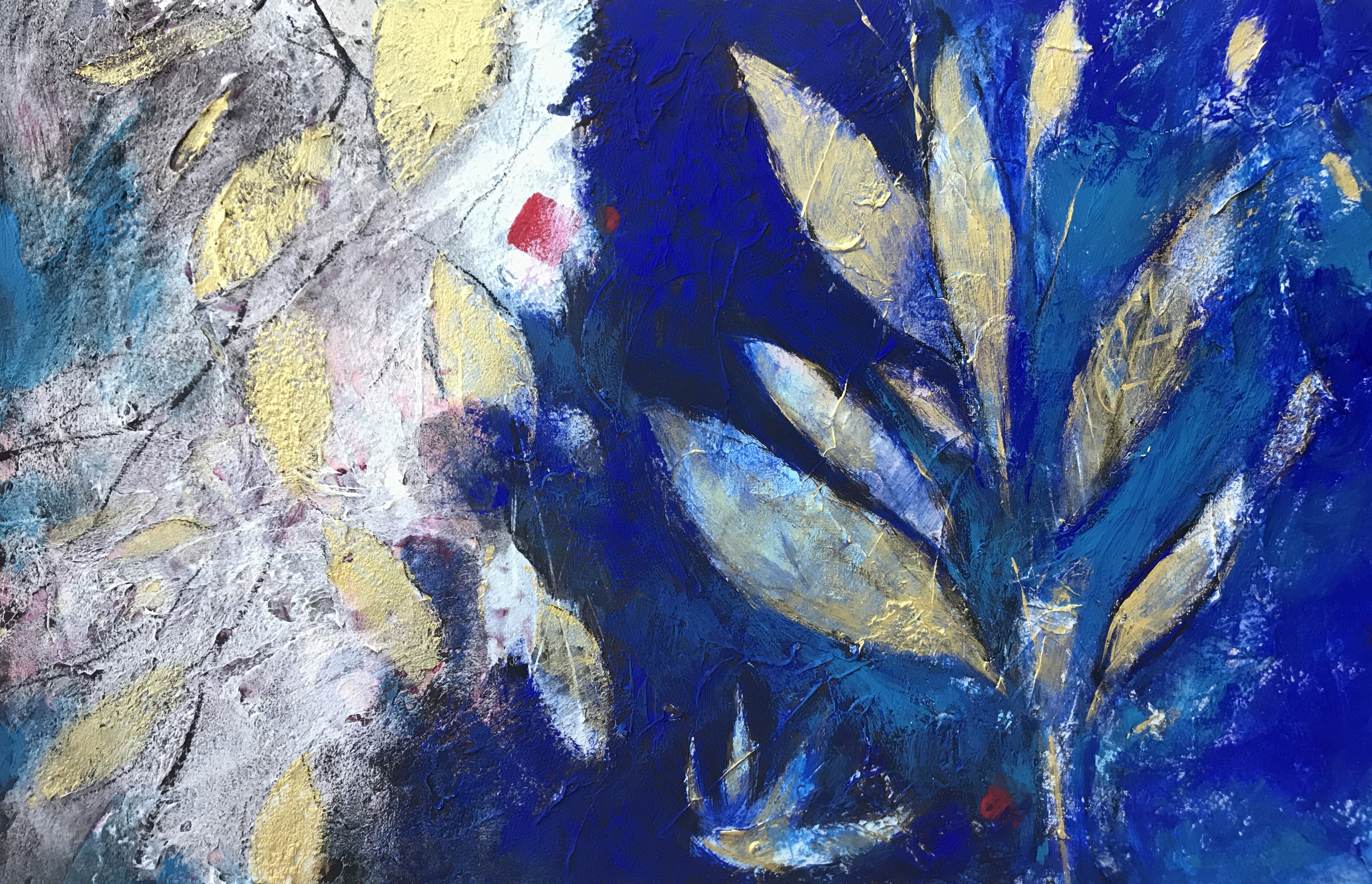 Una narrazione in divenire dove l’artista, supportato dallo studio minuzioso delle foglie rese mediante l’oro, plasma la composizione mediante la suddivisione bicromatica dove l’assetto compositivo materico frammenta il supporto.