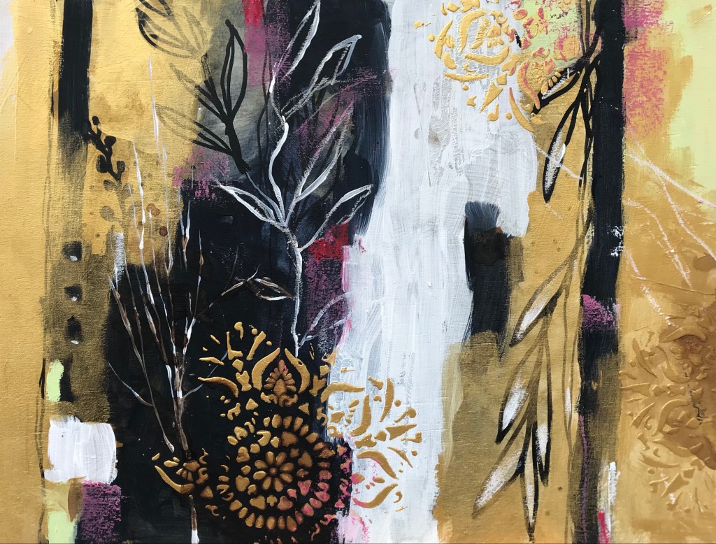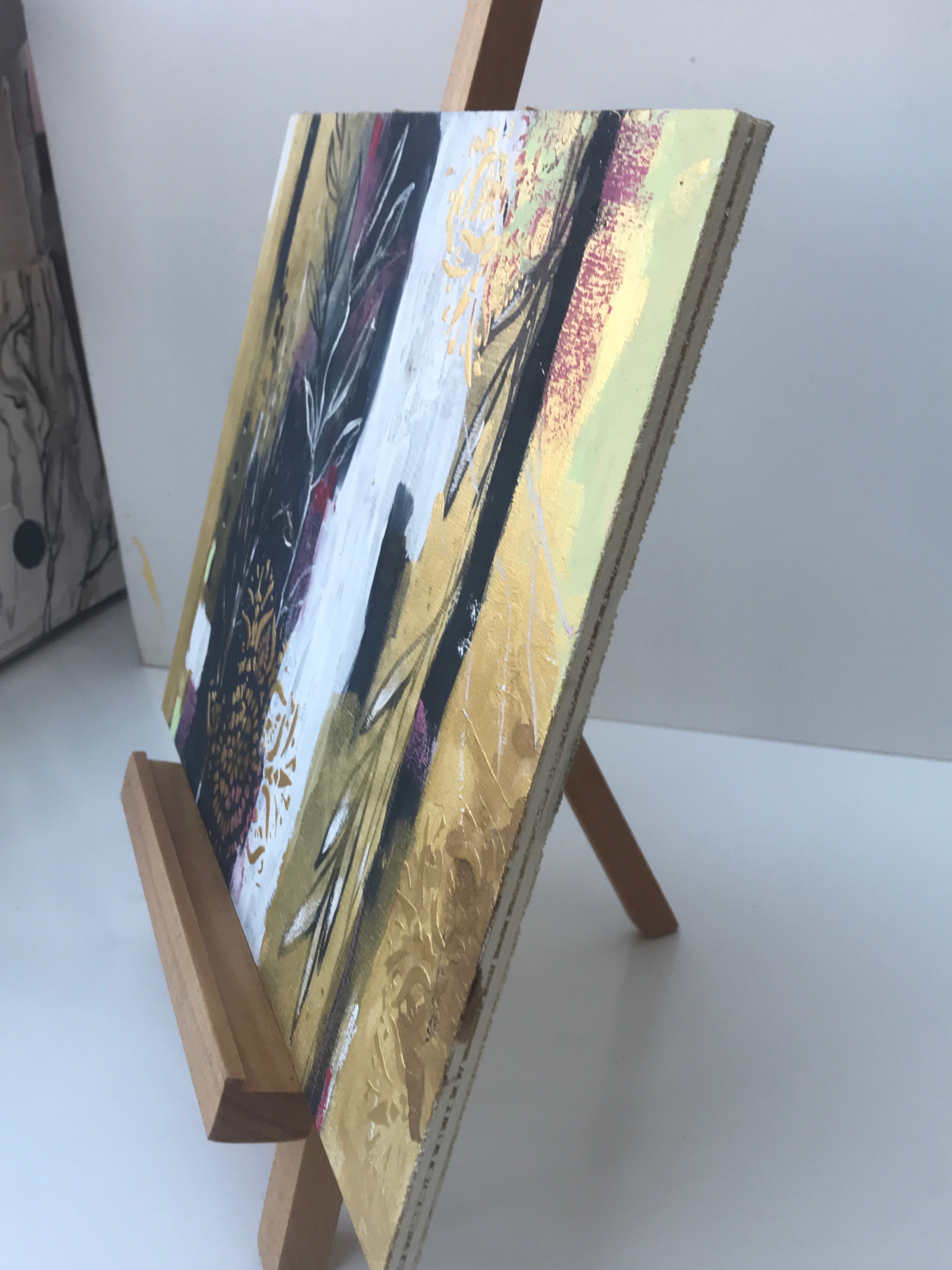 Acrylics, gold and oil pastels on wood board, 24×32 cm