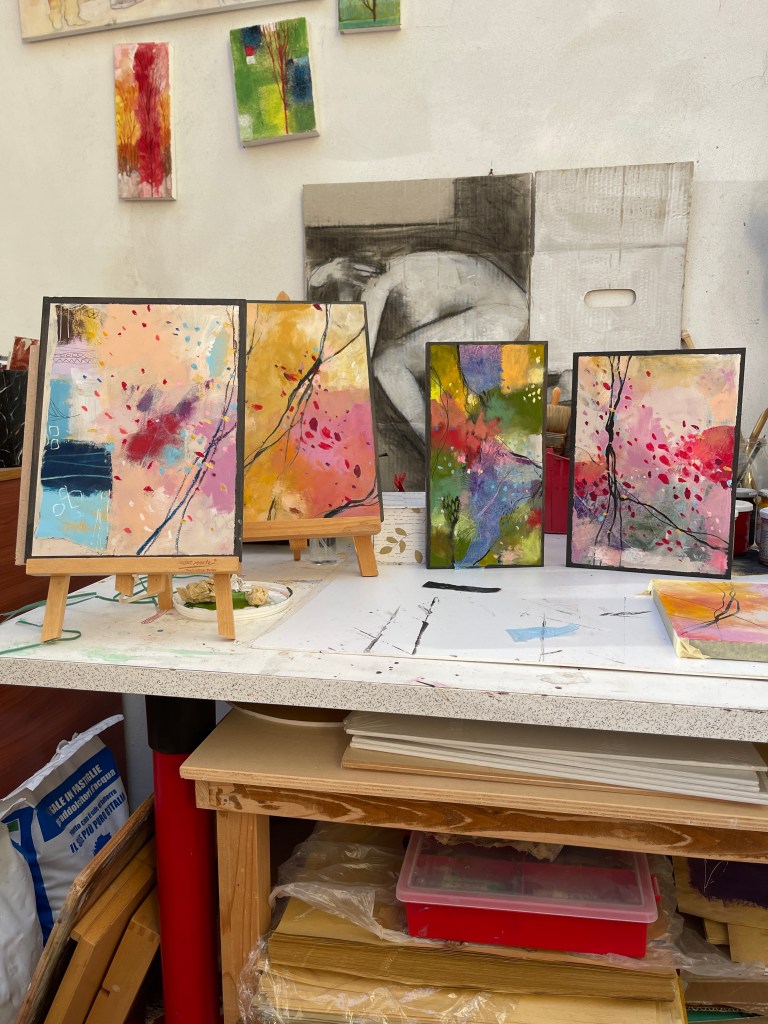This is a serie of paintings all done on sturdy board and layered with acrylics, oil pastels, charcoal, paper collage, with the aim to study colors interactions.