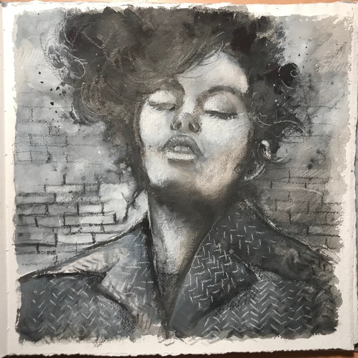 Water-soluble graphite, pastels and gesso on cotton paper sketchbook 12×12 inch