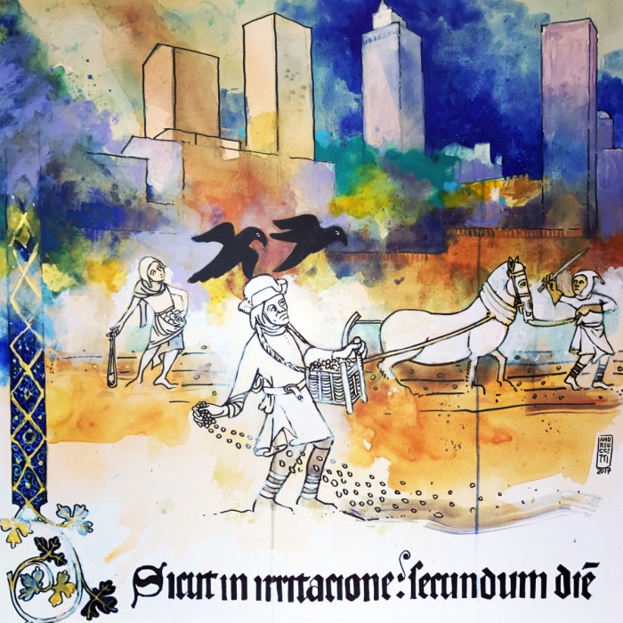 Ispirato ad una miniatura del Salterio di Luttrell “Trovo il tuo acquerello molto bello e puntuale, sia per il soggetto, sia per l’esecuzione che gioca sul ritmo del colore delle torri e le figure in bianco che apparentemente “fantasmi” di un’epoca lontana rafforzano la consistenza […]