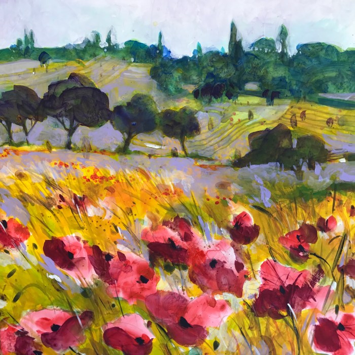 The Tuscan countryside with its ever-endless hills, covered with golden grain dotted with red poppies. There are cypresses in the distance that sway on the ridge and rows of vineyards and lavender fields that seem to smell it. Acquarello acrilico su forex / Watercolor acrylic on […]